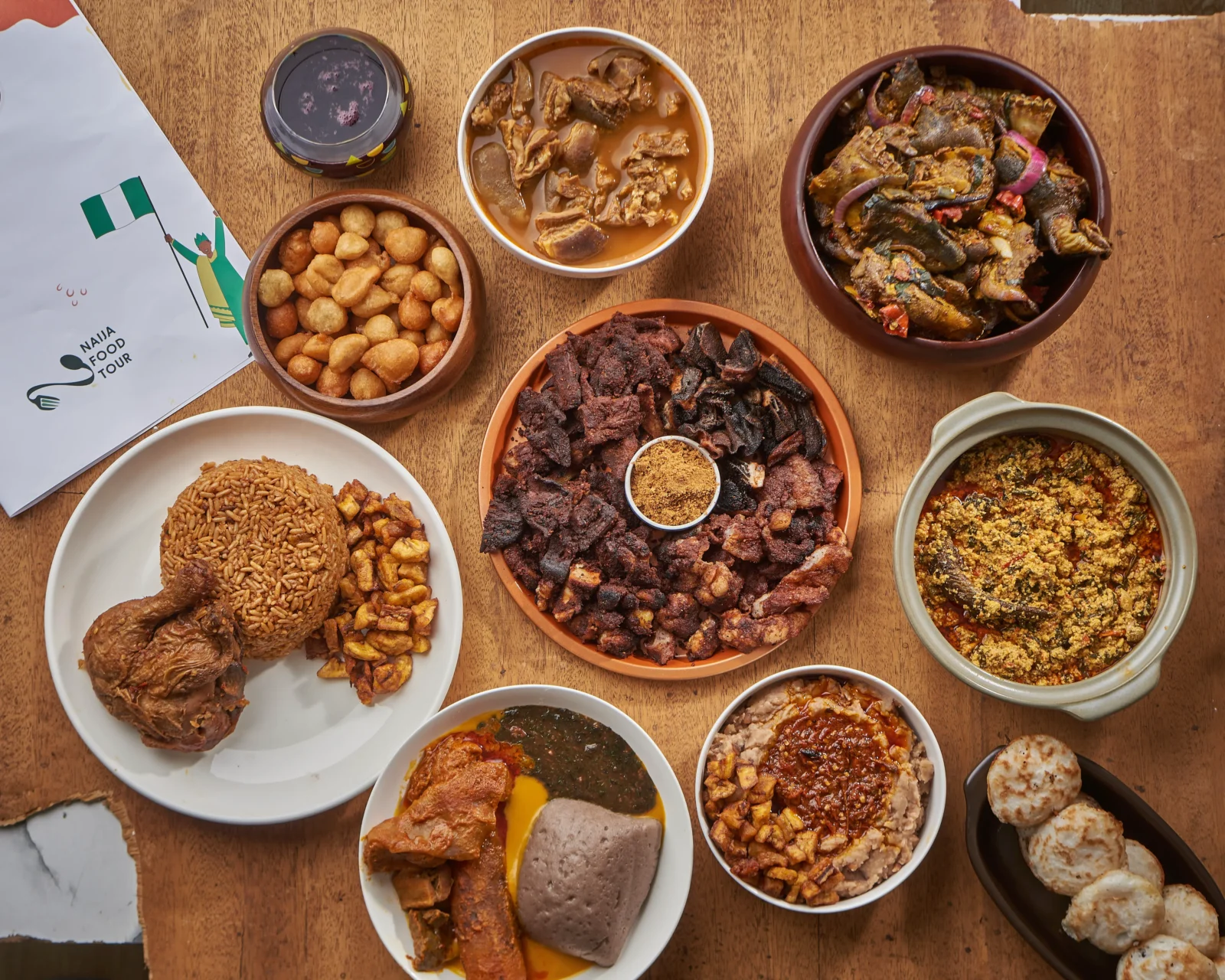Start with Jollof rice, suya, fufu with egusi soup, moi moi, puff-puff, and pepper soup.